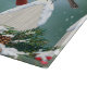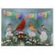 A collection of songbirds on a snow covered fence decorated with Christmas garland. Bird species include eastern bluebird, northern red cardinals, and black-capped chickadee. The fence is adorned with a Christmas garland made of pine branches, cones, and holly berries, accented with gold jingle bells and a bright red ribbon.