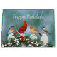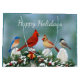 A collection of songbirds on a snow covered fence decorated with Christmas garland. Bird species include eastern bluebird, northern red cardinals, and black-capped chickadee. The fence is adorned with a Christmas garland made of pine branches, cones, and holly berries, accented with gold jingle bells and a bright red ribbon.