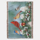 A collection of songbirds on a snow covered fence decorated with Christmas garland. Bird species include eastern bluebird, northern red cardinals, and black-capped chickadee. The fence is adorned with a Christmas garland made of pine branches, cones, and holly berries, accented with gold jingle bells and a bright red ribbon.