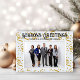 Business holiday greeting cards with big photo template. Gold confetti design with "Seasons Greetings" text - or change it to your preference. Add one more line, in black printed font. The horizontal photo is framed in white with a very pale blue background for the falling confetti and streamers. The back is black with more confetti. Buy printed and mail out, or choose the simple download option for one low price.