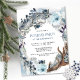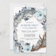 Exquisite holiday or Christmas Party invitation with gorgeous watercolor holiday wreath with flowers, foliage, bow and rustic antlers in dusty blue, navy, silver, sage and white tones. Back in unique blue watercolor wash with cream "present" bow on the top. Collection with coordinating products available.