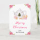 This elegant and festive watercolor Christmas card can be personalised with your family name. It features a teapot and gingerbread cookies. In the corners are beautiful pink poinsettia flowers. The text combines handwritten script and sans serif fonts for a stylish and modern look.