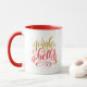 This ceramic coffee mug is shown with a festive holiday jingle bells print.