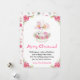 This elegant and festive watercolor Christmas card can be personalised with your family name. It features a cake stand with gingerbread cookies, macarons, candy, hot cocoa and a teapot. In the corners are beautiful pink poinsettia flowers. The text combines handwritten script and sans serif fonts for a stylish and modern look.