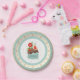 This paper plate features a holiday cupcake with a heart decoration on top. The border around the plate is blue and cream with gold snowflakes and a gold outside edge.