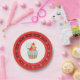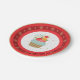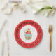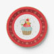 This paper plate features a holiday cupcake with a star decoration on top. The border around the plate is red with gold snowflakes and a gold outside edge.