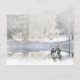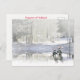 Cute two penguins on a frozen pond ice skating with Santa hats on. A pretty scene of snow and nature with birch and pine trees in the background. Send Happiest of Holiday wishes with this fun postcard.