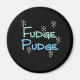Fudge Pudge holiday greeting cards, T-shirts, mugs, tote bags, and other Fudge Pudge items with blue and green text and snowflakes, cute and fun for the holidays, perfect if you love fudge!