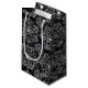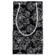 This Christmas holiday gift bag is shown in a black and white snowflakes print design.