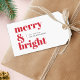 A stylish modern holiday gift tag with a bold retro typography quote “merry & bright” in bright red on a clean white background. This simple yet striking design brings a touch of playful nostalgia to your festive wrapping, perfect for adding personality to any Christmas gift. The greeting and name can be easily customised for a personal touch, whether you’re preparing family presents, client gifts, or party favours. Ideal for modern holiday packaging, these tags pair beautifully with kraft, red, or white wrapping paper for a polished look. A trendy and fun accessory that makes every present stand out this holiday season.