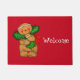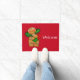 Holiday doormat shown with a red background with a cute gingerbread man welcome print.