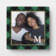 Rustic Christmas photo plaque features your family or loved one's photo in a faux gold frame with a classic white monogram and rustic green holiday plaid pattern.