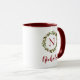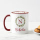 Custom printed Christmas coffee mugs personalised with your family name and monogram initial or other custom text. This design features a simple watercolor wreath of greenery and holly berries, perfect for the holiday season. Use the design tools to choose any background colour, edit the text fonts and colours or upload your own photos to create a one of a kind personalised Christmas gift for family and friends.