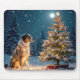 A dog sits beside a snow-covered Christmas tree adorned with lights and ornaments, basking in the glow of a serene, snowy night