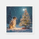 A dog sits beside a snow-covered Christmas tree adorned with lights and ornaments, basking in the glow of a serene, snowy night