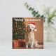 A delightful Christmas greeting card featuring a charming golden retriever in a Santa hat, radiating holiday cheer as it sits beside a dazzling Christmas tree adorned with ornaments and lights. The wrapped presents add a festive touch, creating a heartwarming and whimsical scene.