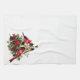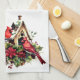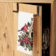 Holiday kitchen towel is shown in a lovely red cardinal bird print design.