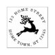 A circular personalised self-inking stamp design featuring a leaping reindeer encircled by your address details. Ideal for adding an extra hand stamped touch to your holiday cards.