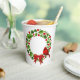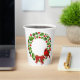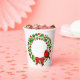 Holiday paper cups is shown here with a festive christmas holly wreath and cardinal print.