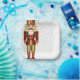 Holiday paper plate is shown in white with a festive Christmas nutcracker print.