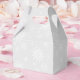 This holiday party favour box is shown in a festive Christmas holiday silver and white snowflakes print.