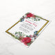 Elegant holiday party invitation features two floral sprigs decorating a gold foil frame. The springs have red roses, white cotton flowers, candy canes, pine and holly greenery. The back of the postcard gives you ample room to send holiday greetings and any instructions for your holiday party.