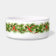 This large size pet bowl is shown with a festive holiday print of garland in fir and mistletoe with red ribbons.