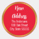 An elegant white script is at the top. You can edit the script if desired (shown: New Address). Three lines of non-script text are under the script. You can edit them to show your name and new address. The sticker is bright red. The gold look border is not foil.