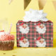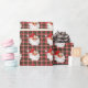 Colourful wrapping paper featuring joyful Santa Claus faces on a vibrant plaid background brings holiday cheer, perfect for gifting during the Christmas season.
