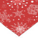 Table runner to accent your table decor is shown in a festive Christmas holiday snowflakes print in red and white.