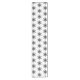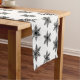 This holiday table runner is shown with a festive black and white winter snowflakes print.