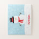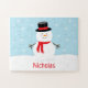 These puzzles make great Christmas gifts or stocking stuffers! This personalised puzzle features a festive holiday snowman with a red scarf. The background is light blue with falling snowflakes.