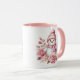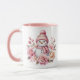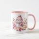This ceramic coffee mug is shown in a festive holiday pink snowman print.