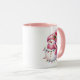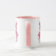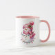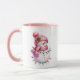 This ceramic coffee mug is shown in a festive holiday pink snowman print.