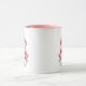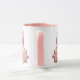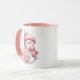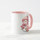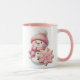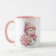 This ceramic coffee mug is shown in a festive holiday pink snowman print.