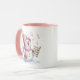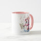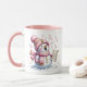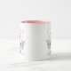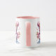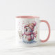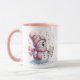This ceramic coffee mug is shown in a festive holiday pink snowman print.