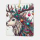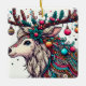 This vibrant illustration features a reindeer adorned with intricate Christmas decorations. Its antlers are transformed into a festive display, adorned with holly, berries, ornaments, and twinkling stars. The reindeer's head is decorated with colourful patterns and beads, capturing the joy and magic of the holiday season.