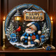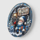 This charming clock face features a festive winter scene with Santa Claus in a blue and white striped scarf and hat. He is surrounded by snow-covered pine trees, a glowing street lamp, and a bright red cardinal perched nearby. A basket filled with wintry blue flowers and berries sits to his side, and a wooden sign above reads "HAPPY HOLIDAYS". The clock hands are black and are set against a background of snowflakes and a dark blue wooden wall.
