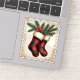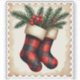 A festive postage stamp design featuring a plaid-patterned Christmas stocking filled with holly berries and pine needles, set against a vintage-style background.