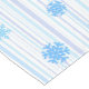 This holiday table runner is shown with a festive Christmas snowflakes and stripes print.