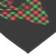 Holiday table runner is shown with a festive deer head print in a green and red plaid.