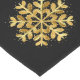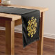 This Christmas holiday table runner is shown with a black background colour and has a festive Christmas gold snowflakes print design.