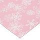 This Christmas holiday table runner is shown with a pink colour background and has a festive Christmas snowflakes print design.