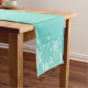 This Christmas holiday table runner is shown with a aqua blue background colour and has a festive Christmas white snowflakes print design.