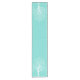 This Christmas holiday table runner is shown with a aqua blue background colour and has a winter white tree print design.