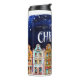 Holiday Thermal Tumbler takes you down a street full of classic homes ready for Christmas. The colours are dark blue, rustic red, light orange, robin egg blue, and olive green. Enjoy this Christmas / Holiday thermal tumbler all season!