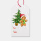 An adorable little gingerbread man wears a red Santa hat and is carrying brightly wrapped gift packages on the front of this gift tag. A gold star is above the gingerbread man, and a decorated Christmas tree is behind him. Your custom text is at the bottom. There's another image of the gingerbread man on the back of the tag, with your custom text at the bottom. Cute for kids of all ages!