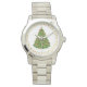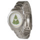 This women's holiday watch is shown in a oversized bracelet style in silver-tone with a holiday Christmas tree print.