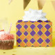 This holiday wrapping paper is shown with a Orange background and a diamond pattern in Purple Violet-Blue and a thinner Yellow stripe.