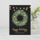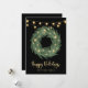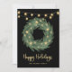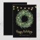 These trendy and stylish holiday cards feature a pretty, watercolor holiday wreath with gold coloured star accents and elegant string lights, with modern script calligraphy that says "happy holidays" on a black background.